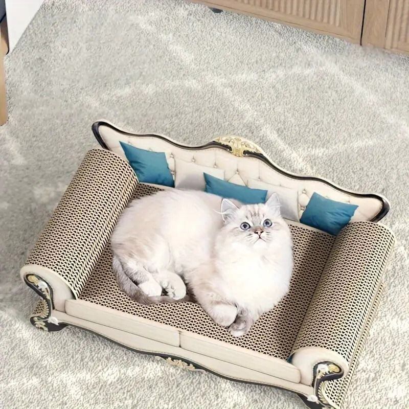 ロココ調の優雅な雰囲気を纏ったソファ型の猫用爪とぎベッドは、まるで小さな王宮の家具のような佇まい。