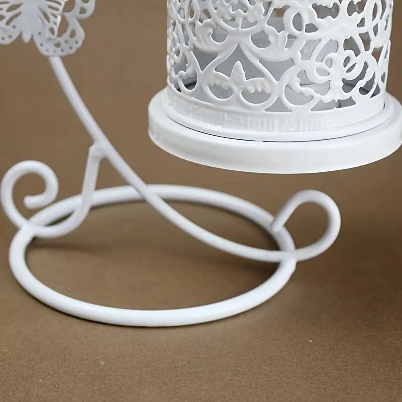 繊細な蝶の装飾が施された、白いメタルランタン。