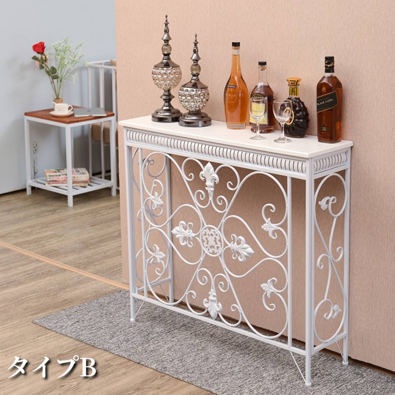 玄関テーブル ロココ調 ヨーロピアン エレガント メタル ハードウッド 組み立て不要 クラシック装飾カットアウト 収納棚付き アンティーク 猫脚 サイドボード 高級感 ホワイト ブラック 姫系