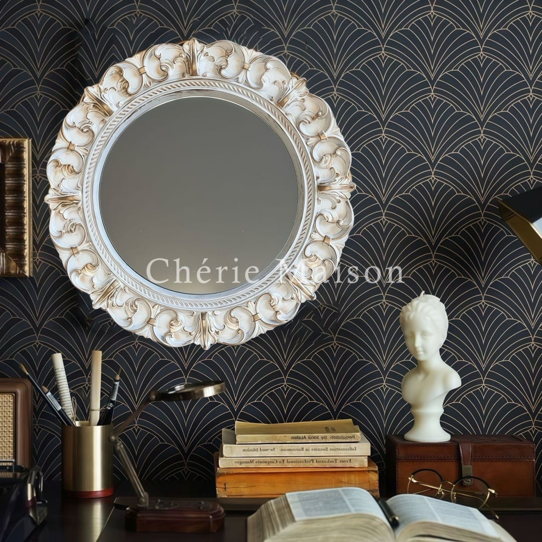 高級感あふれるアンティーク調のミラーは、壁掛けタイプで寝室や玄関に優雅な雰囲気を漂わせます。繊細なロココ調の彫刻が施されたデザインは、まるで貴族の邸宅にあるかのような華やかさを持ち、お部屋のインテリアに特別なアクセントを加えます。