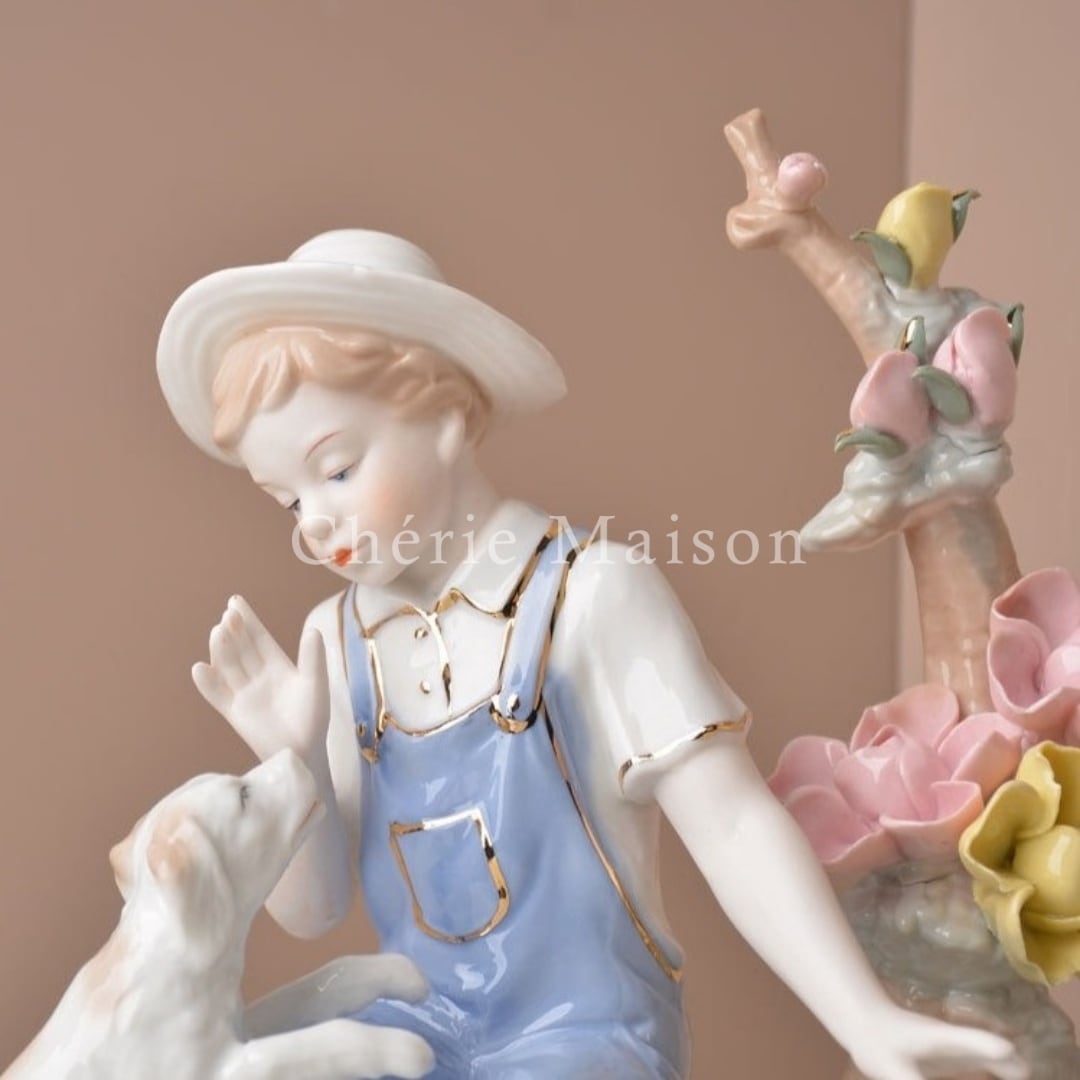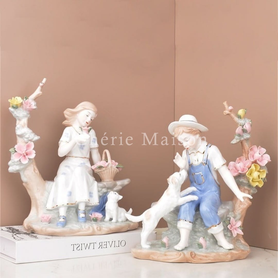 優美な情景をそのまま閉じ込めたかのような、ロココ調のオブジェセット。可憐な少女と少年、そして愛らしい子犬たちが織りなす穏やかなひとときは、まるでヨーロピアンアンティークの世界から届いたかのような気品と温もりを感じさせます。繊細な色彩と丁寧な造形、花々のあしらいが調和し、姫系インテリアにふさわしい優雅でロマンティックな雰囲気を演出します。