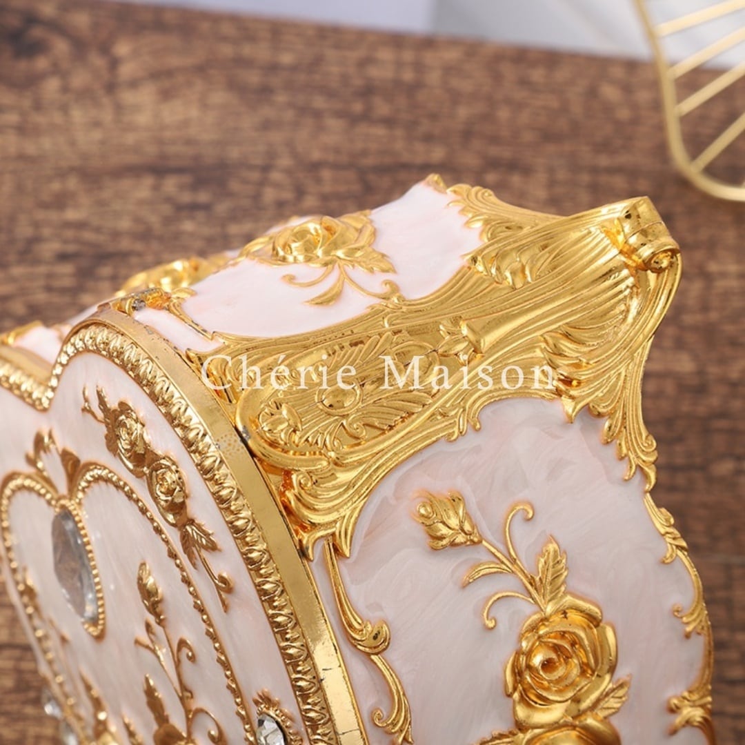 高級感あふれるこちらのハート型ジュエリーボックスは、ロココ調のヨーロピアンデザインが魅力の特別なアイテムです。美しいミラー付きのこの宝石箱は、あなたの大切なジュエリーや小物を優雅に収納するための理想的な場所を提供し、まるでお姫様の夢の世界にいるかのような感覚を味わうことができます。アンティークな雰囲気とともに繊細な彫刻や豪華な装飾が施され、シンプルなお部屋を一瞬で華やかに演出します。